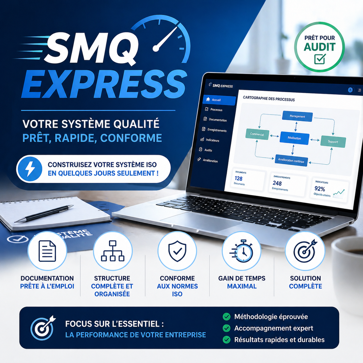 La certification ISO 9001 répond à plusieurs enjeux : accéder à des marchés exigeants (appels d'offres publics, donneurs d'ordre, marchés internationaux), structurer son organisation, améliorer la satisfaction client, réduire les non-conformités et renforcer son image de marque.